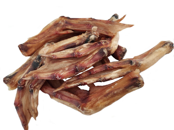 Duck feet are digestible and the bones are easily crushed without splintering. Their awkward shapes make them entertaining for dogs to eat as well as being a good dental aid. Duck feet are high in protein and chondroitin which are good for joint health.